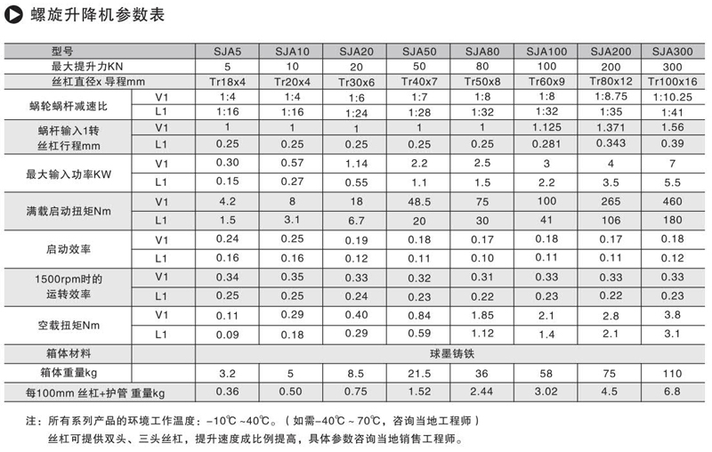 工作制為10分鐘內工作時間的百分比,SJA系列普通齒螺旋升降機的工作制為30%,滾珠絲杠螺旋升降機的工作制為50%,當實際負載小于額定負載時,可以適當提高工作制,具體咨詢當地工程師。