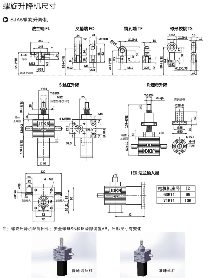 SJA螺旋升降機又稱SJA絲杠升降機,本產品是一種超重部件,可起升、下降及借助附件實現推進、翻轉及各種高度位置調整等功能。結構及裝配形式可選,可按客戶要求定制,安裝方便、使用靈活、功能多、配套及形式多、可靠性好、使用壽命長等優點。