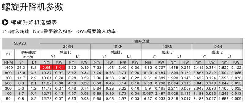 螺旋升降機正常工作狀態下的輸入功率不能超過最大輸入功率,輸入功率kw=(滿載扭矩Nm x負載率x輸入轉速rpm )/ 9550m,