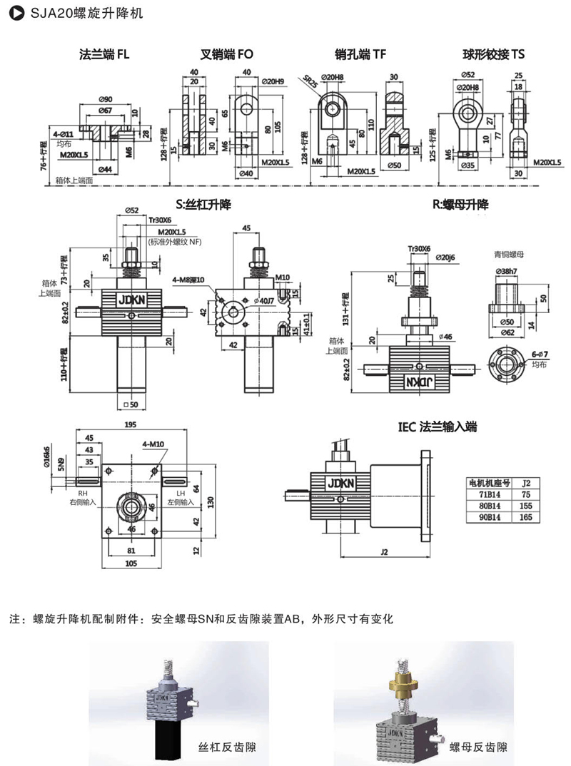 SJA螺旋升降機又稱SJA絲杠升降機,本產品是一種超重部件,可起升、下降及借助附件實現推進、翻轉及各種高度位置調整等功能。結構及裝配形式可選,可按客戶要求定制,安裝方便、使用靈活、功能多、配套及形式多、可靠性好、使用壽命長等優點。