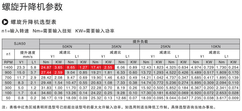 螺旋升降機正常工作狀態下的輸入功率不能超過最大輸入功率,輸入功率kw=(滿載扭矩Nm x負載率x輸入轉速rpm )/ 9550m,