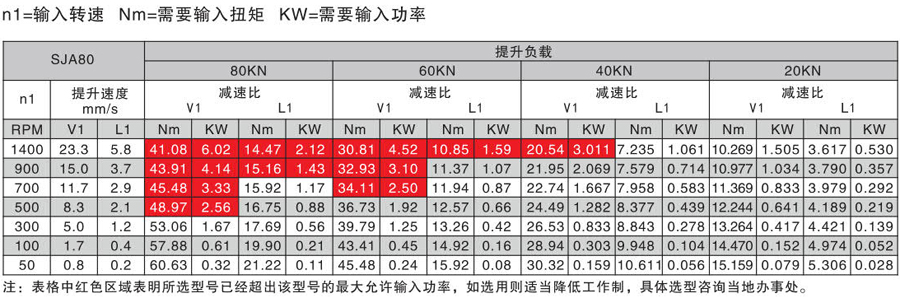 螺旋升降機正常工作狀態下的輸入功率不能超過最大輸入功率,輸入功率kw=(滿載扭矩Nm x負載率x輸入轉速rpm )/ 9550m,